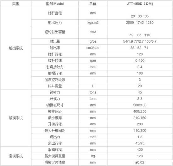 1、本款机器为JTT-450单滑板立式注塑机,锁模力:45T ;射出量:1-115g