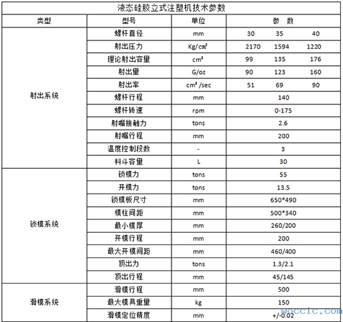 e.本款机器为55吨立式机,射出量:1-1407g,锁模力:55-160T
