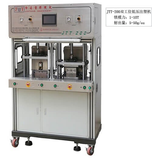 a、注塑机可以双射头注塑,后侧注胶方式.